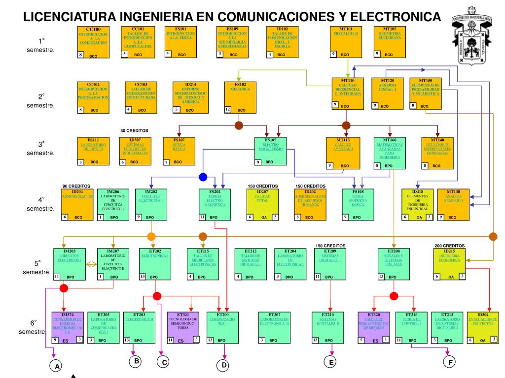 CC103 TALLER DE PROGRAMCION ESTRUCTURADA FS102 MECANICA ID214 ENTORNO SOCIOECONOMIC DE MEXICO Y AMERICA 4 12 5 ID102 TALLER DE COMUNICACIÓN ORAL Y ESCRITA CC100 INTRODUCCION A LA COMPUTACION MT101 PRECALCULO FS109 INTRODUCCION A LA METODOLIGIA EXPERIMENTAL MT105 GEOMETRIA EUCLIDIANA CC101 TALLER DE INTRODUCCION A LA COMPUTACION FS101 INTRODUCCION A LA FISICA 3 11 3 9 9 8 4 ID202 ADMINISTRACION DE RECURSOS HUMANOS ID215 INGENIERIA ECONOMICA ID418 ELEMENTOS DE INGENIERIA INDUSTRIAL MT130 ANALISIS NUMERICO IM207 LABORSTORIO DE CIRCUITOS ELECTRICO II IM202 CIRCUITOS ELECTRICOS 1 ET212 TALLER DE SISTEMAS DIGITALES 1 ET208 SEÑALES Y SISTEMAS LINEALES FS111 LABORATORIO DE OPTICA ET320 TALLER DE PROCESO DIGITAL DE SEÑALES ET203 ELECTRONICA II FS108 FISICA MODERNA BASICA ET210 SISTEMAS DIGITALES II ET200 COMUNICACIO- NES 1 FS202 TEORIA ELECTRO MAGNETICA ET205 LABORATORIO DE COMUNICACIO- NES 1 ID204 ADMINISTRACION ET213 LABORATORIO DE SISTEMAS DIGITALES II ET209 SISTEMAS DIGITALES 1 ET207 LABORATORI DE ELECTRONICA II ID207 CALIDAD TOTAL ET321 TECNOLOGIA DE SEMICONDUC- TORES IM374 CONVERSION DE ENERGIA ELECTROMECANICA MT113 CALCULO AVANZADO ET215 TALLER DE MEDICIONES ELECTRONICAS CC102 INTRODUCCION A LA PROGRAMACION MT140 ECUACIONES DIFERENCIALES ORDINARIAS FS107 OPTICA BASICA MT160 MATEMATICAS AVANZADAS PARA INGENIERIA ID304 EVALUACION DE PROYECTOS ET216 TEORIA DE CONTROL I ID307 SISTEMAS ECOLOGICOS INDUSTRIALES IM203 CIRCUITOS ELECTRICOS 2 ET202 ELECTRONICA 1 IM206 LABORSTORIO DE CIRCUITOS ELECTRICO 1 ET204 LABORATORIO DE ELECTRONICA 1 FS105 ELECTRO MAGNETISMO 13 3 5 11 13 3 3 13 4 6 3 9 4 8 11 6 11 13 11 13 1 9 7 3 6 11 6 6 1 8 6 9 9 9 6 9 8 MT120 ALGEBRA LINEAL 1 MT150 ELEMENTOS DE PROBABILIDAD Y ESTADISTICA MT110 CALCULO DIFERENCIAL E INTEGRADA 9 9 8 LICENCIATURA INGENIERIA EN COMUNICACIONES Y ELECTRONICA 1° semestre. BCO BCO BCO BCO BCO BCO BCO 2° semestre. BCO BCO BCO BCO BCO BCO BCO 80 CREDITOS 3° semestre. BCO BCO BCO BPO BCO BPO BCO 90 CREDITOS 150 CREDITOS 150 CREDITOS 4° semestre. BCO BPO BPO BPO OA BCO BPO OA BCO 3 3 150 CREDITOS 200 CREDITOS 5° semestre. BPO BPO BPO BPO BPO BPO BPO BPO OA 3 6° semestre. ES BPO BPO ES BPO BPO BPO ES BPO BPO OA 3 3 1 3 B C E F D A