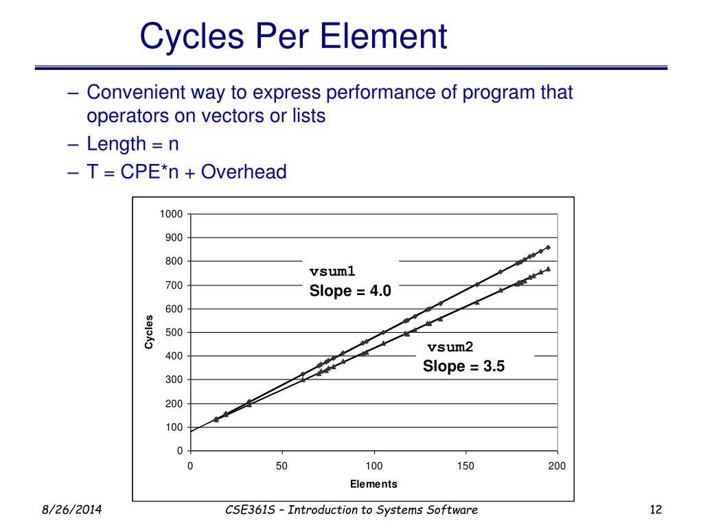 Cycles Per Element • Convenient way to express performance of program that operators on vectors or lists • Length = n • T = CPE*n + Overhead vsum1 Slope = 4.0 vsum2 Slope = 3.5 CSE361S – Introduction to Systems Software