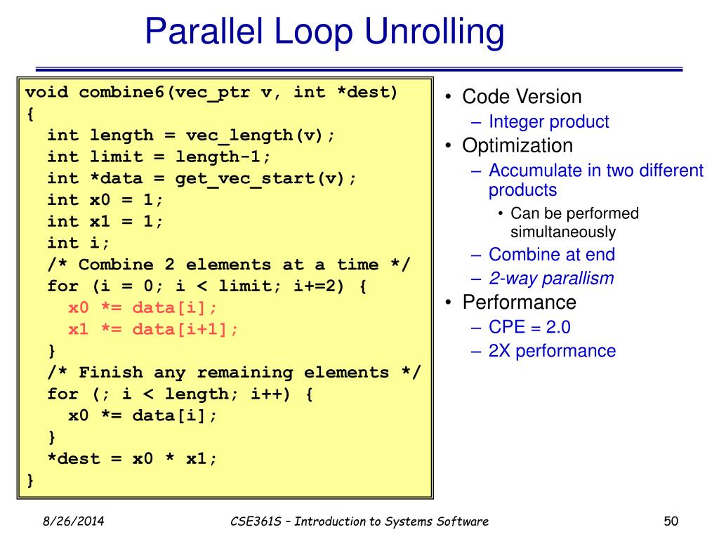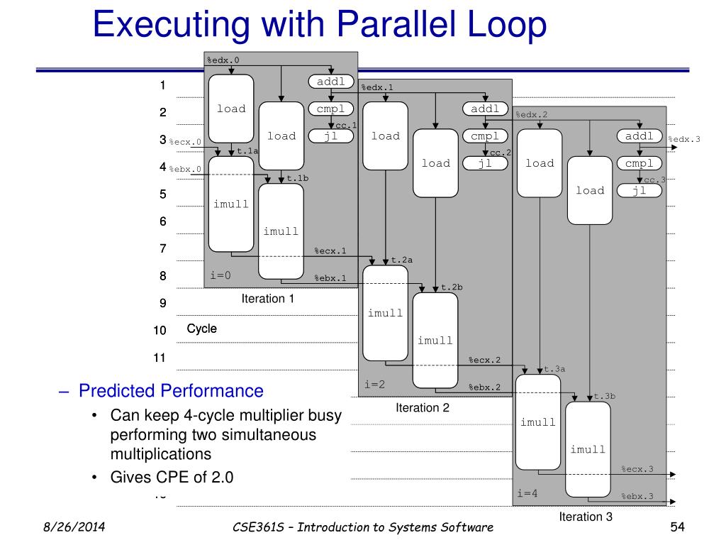 Executing with Parallel Loop • Predicted Performance • Can keep 4-cycle multiplier busy performing two simultaneous multiplications • Gives CPE of 2.0 CSE361S – Introduction to Systems Software