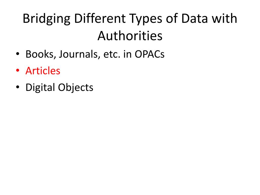 Bridging Different Types of Data with Authorities • Books, Journals, etc. in OPACs • Articles • Digital Objects