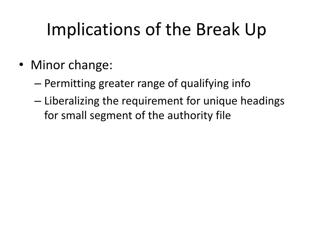 Implications of the Break Up • Minor change: • Permitting greater range of qualifying info • Liberalizing the requirement for unique headings for small segment of the authority file