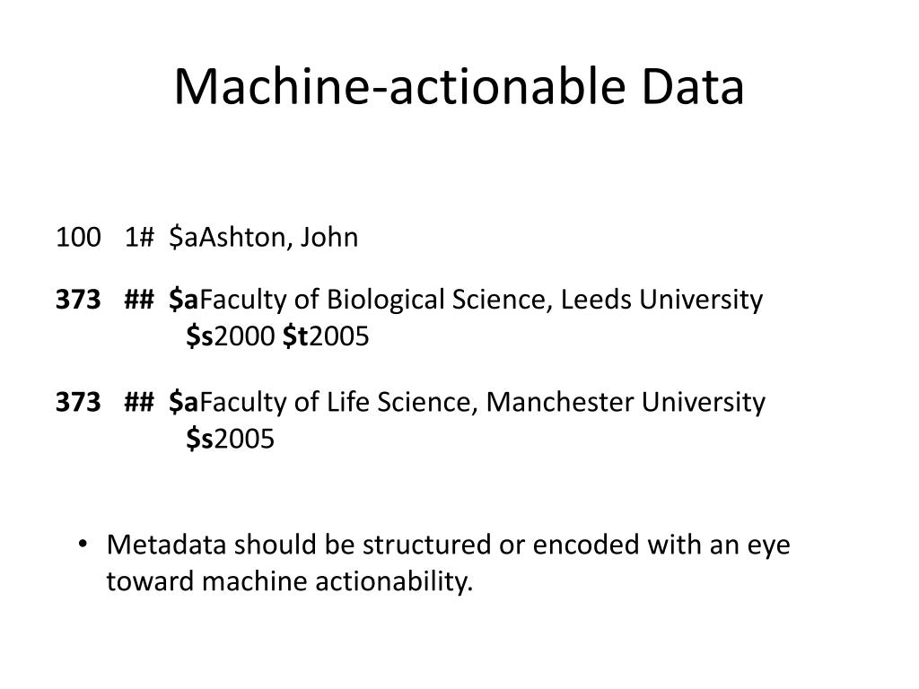 Machine-actionable Data • Metadata should be structured or encoded with an eye toward machine actionability.