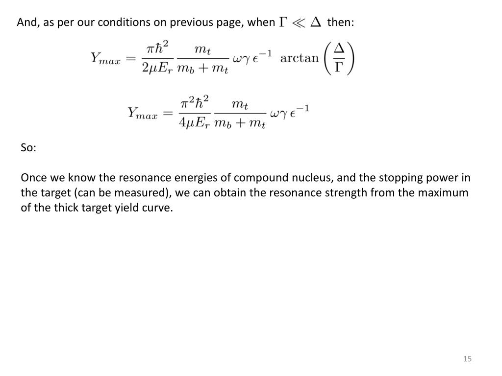 And, as per our conditions on previous page, when then: So: Once we know the resonance energies of compound nucleus, and the stopping power in the target (can be measured), we can obtain the resonance strength from the maximum of the thick target yield curve.