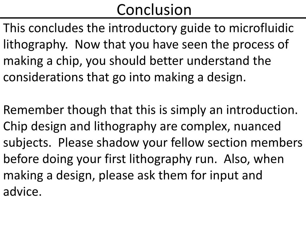 Conclusion This concludes the introductory guide to microfluidic lithography. Now that you have seen the process of making a chip, you should better understand the considerations that go into making a design. Remember though that this is simply an introduction. Chip design and lithography are complex, nuanced subjects. Please shadow your fellow section members before doing your first lithography run. Also, when making a design, please ask them for input and advice.