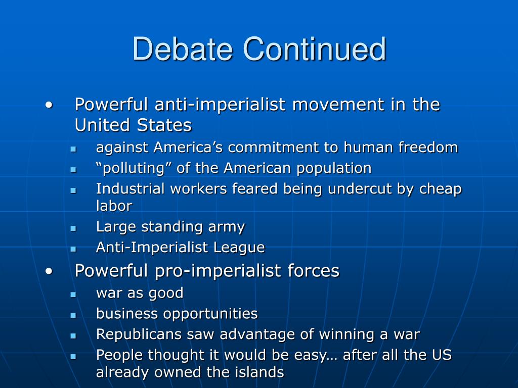Debate Continued • Powerful anti-imperialist movement in the United States • against America’s commitment to human freedom • “polluting” of the American population • Industrial workers feared being undercut by cheap labor • Large standing army • Anti-Imperialist League • Powerful pro-imperialist forces • war as good • business opportunities • Republicans saw advantage of winning a war • People thought it would be easy… after all the US already owned the islands