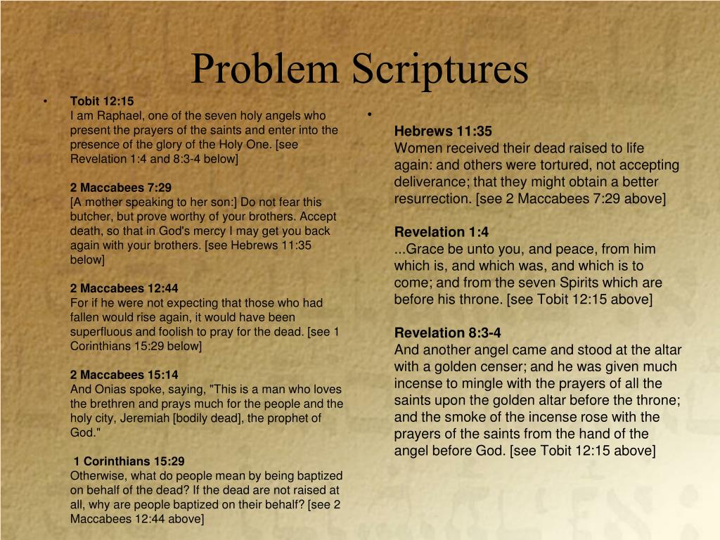 Problem Scriptures Hebrews 11:35Women received their dead raised to life again: and others were tortured, not accepting deliverance; that they might obtain a better resurrection. [see 2 Maccabees 7:29 above] Revelation 1:4 ...Grace be unto you, and peace, from him which is, and which was, and which is to come; and from the seven Spirits which are before his throne. [see Tobit 12:15 above] Revelation 8:3-4 And another angel came and stood at the altar with a golden censer; and he was given much incense to mingle with the prayers of all the saints upon the golden altar before the throne; and the smoke of the incense rose with the prayers of the saints from the hand of the angel before God. [see Tobit 12:15 above] • Tobit 12:15 I am Raphael, one of the seven holy angels who present the prayers of the saints and enter into the presence of the glory of the Holy One. [see Revelation 1:4 and 8:3-4 below]2 Maccabees 7:29[A mother speaking to her son:] Do not fear this butcher, but prove worthy of your brothers. Accept death, so that in God's mercy I may get you back again with your brothers. [see Hebrews 11:35 below]2 Maccabees 12:44 For if he were not expecting that those who had fallen would rise again, it would have been superfluous and foolish to pray for the dead. [see 1 Corinthians 15:29 below]2 Maccabees 15:14And Onias spoke, saying, "This is a man who loves the brethren and prays much for the people and the holy city, Jeremiah [bodily dead], the prophet of God." 1 Corinthians 15:29 Otherwise, what do people mean by being baptized on behalf of the dead? If the dead are not raised at all, why are people baptized on their behalf? [see 2 Maccabees 12:44 above]