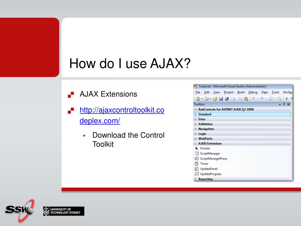 How do I use AJAX? • AJAX Extensions • http://ajaxcontroltoolkit.codeplex.com/ • Download the Control Toolkit