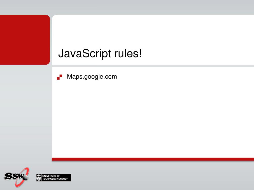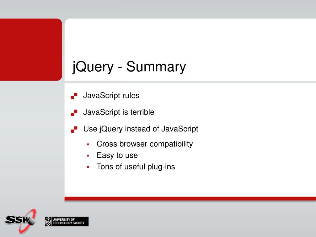 Why JQuery?3 good reasons • 1- Cross-browser (IE 6.0+, Firefox 2+, Safari 3.0+, Opera 9.0+, Chrome) • 2- Powerful and easy to use • Same selectors as in CSS • Designers can learn it fast • More readable JavaScript code • 3 – Plug-ins • Tons of useful plug-ins and functionalities As per rule http://www.ssw.com.au/ssw/Standards/Rules/RulesToBetterWebsitesDevelopment.aspx#JQuery