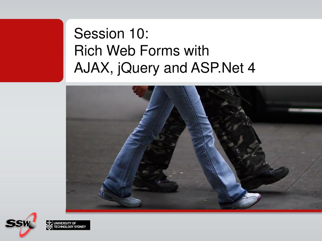 Developing Windows and Web Applications using Visual Studio.NET #10: Rich Web Forms with AJAX, jQuery and ASP.Net 4. Gerard Beckerleg. Session 10: Rich Web Forms with AJAX, jQuery and ASP.Net 4. Agenda. User experience and Usability AJAX Cross Page Post-backs Validation Groups