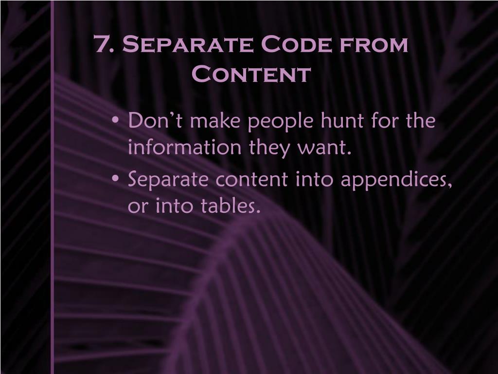 7. Separate Code from Content • Don’t make people hunt for the information they want. • Separate content into appendices, or into tables.
