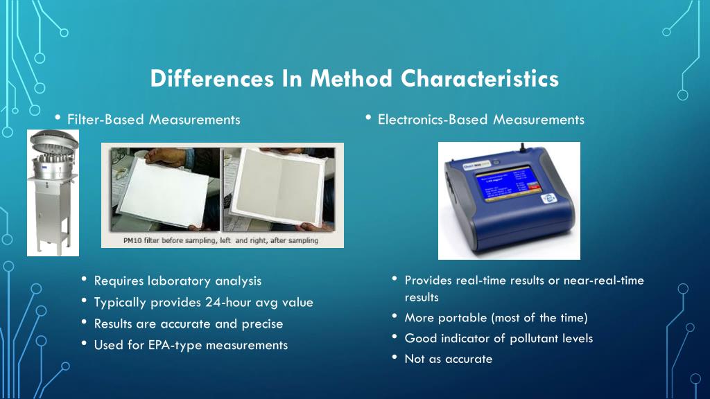 Differences In Method Characteristics • Filter-Based Measurements • Requires laboratory analysis • Typically provides 24-hour avg value • Results are accurate and precise • Used for EPA-type measurements • Electronics-Based Measurements • Provides real-time results or near-real-time results • More portable (most of the time) • Good indicator of pollutant levels • Not as accurate