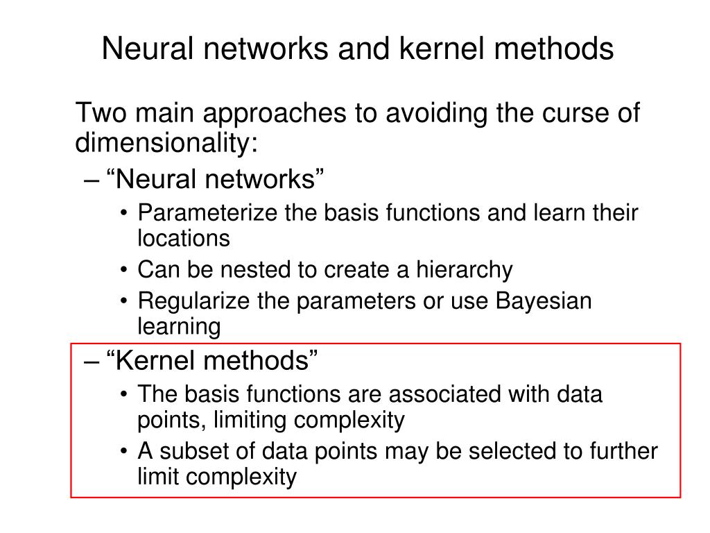 Neural networks and kernel methods Two main approaches to avoiding the curse of dimensionality: • “Neural networks” • Parameterize the basis functions and learn their locations • Can be nested to create a hierarchy • Regularize the parameters or use Bayesian learning • “Kernel methods” • The basis functions are associated with data points, limiting complexity • A subset of data points may be selected to further limit complexity
