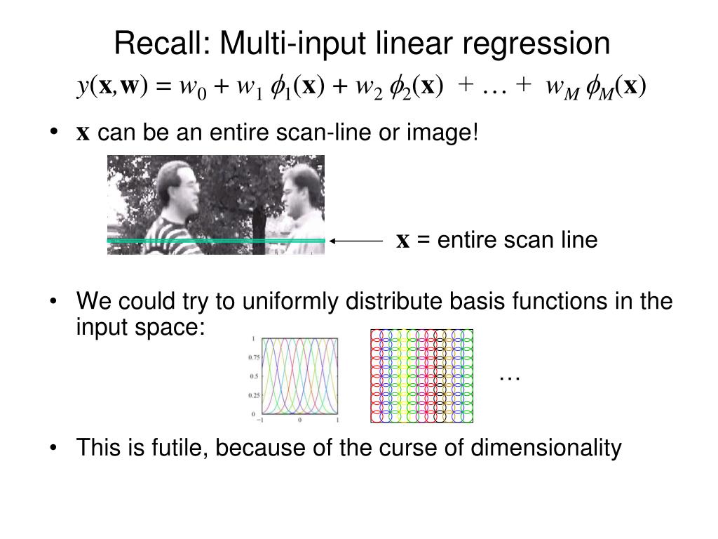 Recall: Multi-input linear regression y(x,w)= w0+ w1 f1(x)+ w2 f2(x)+ … + wM fM(x) • xcan be an entire scan-line or image! • We could try to uniformly distribute basis functions in the input space: • This is futile, because of the curse of dimensionality x = entire scan line …