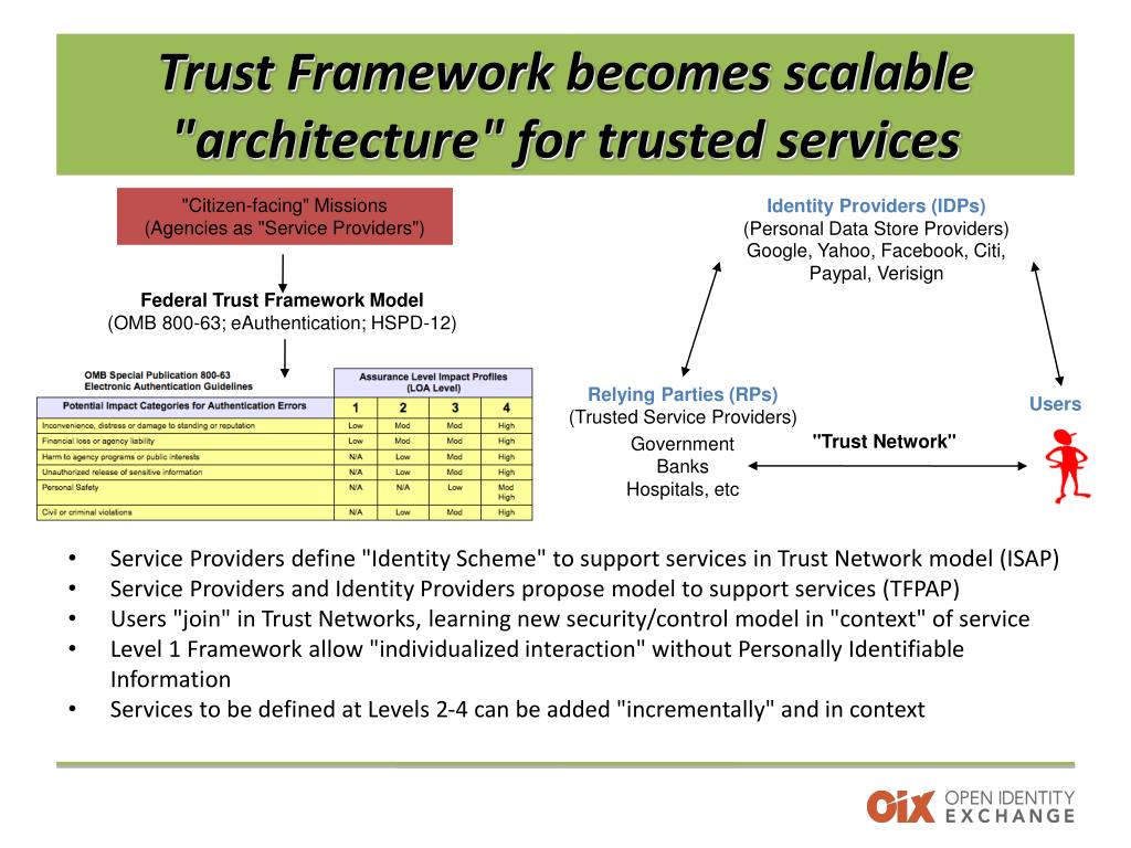 Identity Providers (IDPs) (Personal Data Store Providers) Google, Yahoo, Facebook, Citi, Paypal, Verisign Relying Parties (RPs) (Trusted Service Providers) Government Banks Hospitals, etc Trust Framework becomes scalable "architecture" for trusted services "Citizen-facing" Missions (Agencies as "Service Providers") Federal Trust Framework Model (OMB 800-63; eAuthentication; HSPD-12) Users "Trust Network" Service Providers define "Identity Scheme" to support services in Trust Network model (ISAP) Service Providers and Identity Providers propose model to support services (TFPAP) Users "join" in Trust Networks, learning new security/control model in "context" of service Level 1 Framework allow "individualized interaction" without Personally Identifiable Information Services to be defined at Levels 2-4 can be added "incrementally" and in context