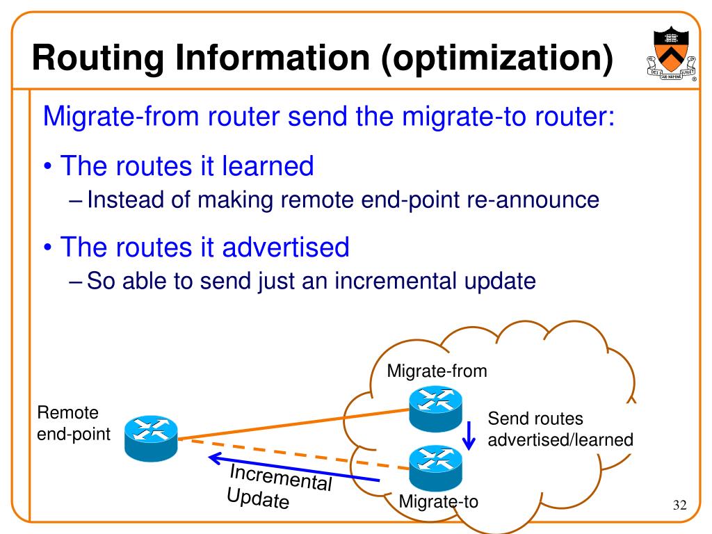 Routing Information (optimization) Migrate-from router send the migrate-to router: • The routes it learned • Instead of making remote end-point re-announce • The routes it advertised • So able to send just an incremental update mi Migrate-from Remote end-point Send routes advertised/learned Incremental Update Migrate-to