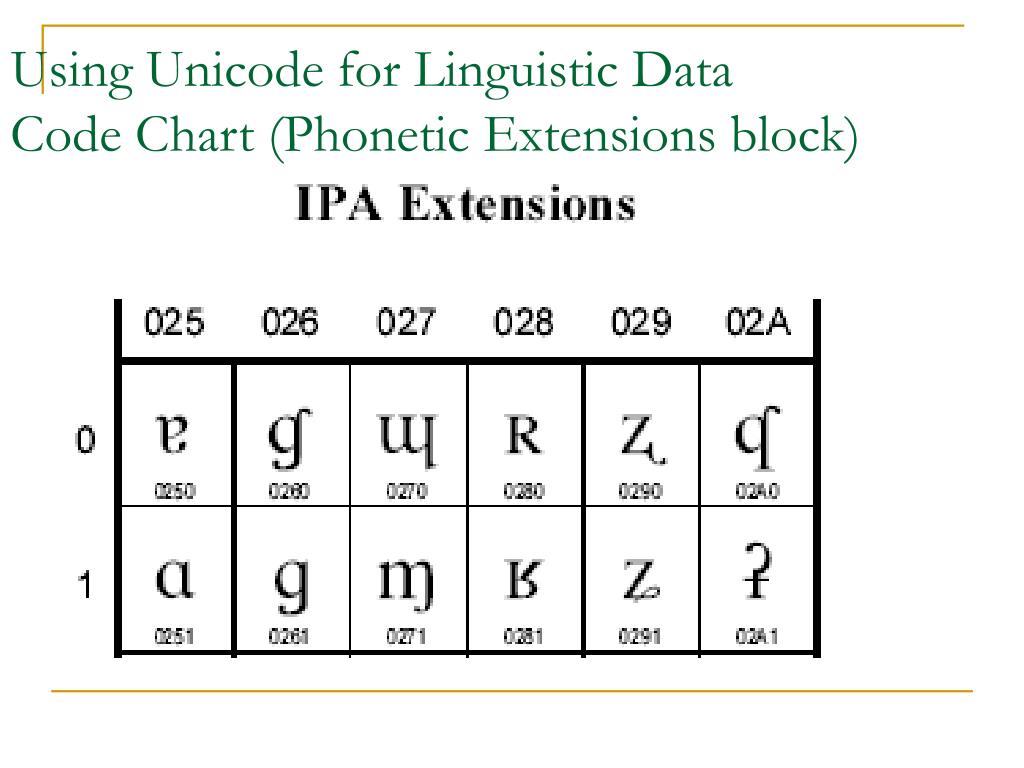 Using Unicode for Linguistic DataSteps to using Unicode Finding the character you need 1. See if it is in Unicode: • Check the IPA blocks (etc.) on the Unicode website • Check Appendix 2 of the IPA Handbook or a Web version of the IPA symbols