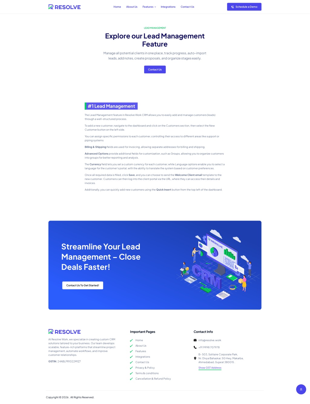 1. Home About Us Features  Integrations Contact Us Schedule a Demo LEAD MANAGEMENT Explore our Lead Management Feature Manage all potential clients in one place, track progress, auto-import leads, add notes, create proposals, and organize stages easily. Contact Us #1 Lead Management The Lead Management feature in Resolve Work CRM allows you to easily add and manage customers (leads) through a well-structured process. To add a new customer, navigate to the dashboard and click on the Customers section, then select the New Customer button on the left side. You can assign specific permissions to each customer, controlling their access to di?erent areas like support or piping systems Billing & Shipping fields are used for invoicing, allowing separate addresses for billing and shipping. Advanced Options provide additional fields for customization, such as Groups, allowing you to organize customers into groups for better reporting and analysis. The Currency field lets you set a custom currency for each customer, while Language options enable you to select a language for the customer’s portal, with the ability to translate the system based on customer preferences. Once all required data is filled, click Save, and you can choose to send the Welcome Client email template to the new customer. Customers can then log into the client portal via the URL, where they can access their details and invoices. Additionally, you can quickly add new customers using the Quick Insert button from the top left of the dashboard. Streamline Your Lead Management – Close Deals Faster! Contact Us To Get Started! Important Pages Contact Info At Resolve Work, we specialize in creating custom CRM solutions tailored to your business. Our team develops scalable, feature-rich platforms that streamline project management, automate workflows, and improve customer relationships. Home info@resolve.work About Us +91 9998 707978 Features B- 503, Solitaire Corporate Park, Nr. Divya Bahaskar, SG Hwy, Makarba, Ahmedabad, Gujarat 380015 . Integrations GSTIN: 24ABLFR1022M1Z7 Contact Us Privacy & Policy Show GST Address Terms & conditions Cancellation & Refund Policy  Copyright © 2026 . All Rights Reserved.