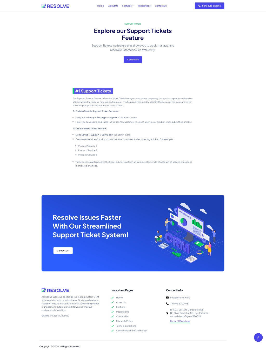 1. Home About Us Features  Integrations Contact Us Schedule a Demo SUPPORT TICKETS Explore our Support Tickets Feature Support Tickets is a feature that allows you to track, manage, and resolve customer issues e?ciently. Contact Us #1 Support Tickets The Support Tickets feature in Resolve Work CRM allows your customers to specify the service or product related to a ticket when they open a new support request. This helps admins quickly identify the nature of the issue and direct it to the appropriate department or service team. To Enable/Disable Support Ticket Services: Navigate to Setup > Settings > Support in the admin menu. Here, you can enable or disable the option for customers to select a service or product when submitting a ticket. To Create a New Ticket Service: Go to Setup > Support > Services in the admin menu. Create new services/products that customers can select when opening a ticket. For example: Product/Service 1 Product/Service 2 Product/Service 3 These services will appear in the ticket submission form, allowing customers to choose which service or product the ticket pertains to. Resolve Issues Faster With Our Streamlined Support Ticket System! Contact Us! Important Pages Contact Info At Resolve Work, we specialize in creating custom CRM solutions tailored to your business. Our team develops scalable, feature-rich platforms that streamline project management, automate workflows, and improve customer relationships. Home info@resolve.work About Us +91 9998 707978 Features B- 503, Solitaire Corporate Park, Nr. Divya Bahaskar, SG Hwy, Makarba, Ahmedabad, Gujarat 380015 . Integrations GSTIN: 24ABLFR1022M1Z7 Contact Us Privacy & Policy Show GST Address Terms & conditions Cancellation & Refund Policy  Copyright © 2026 . All Rights Reserved.