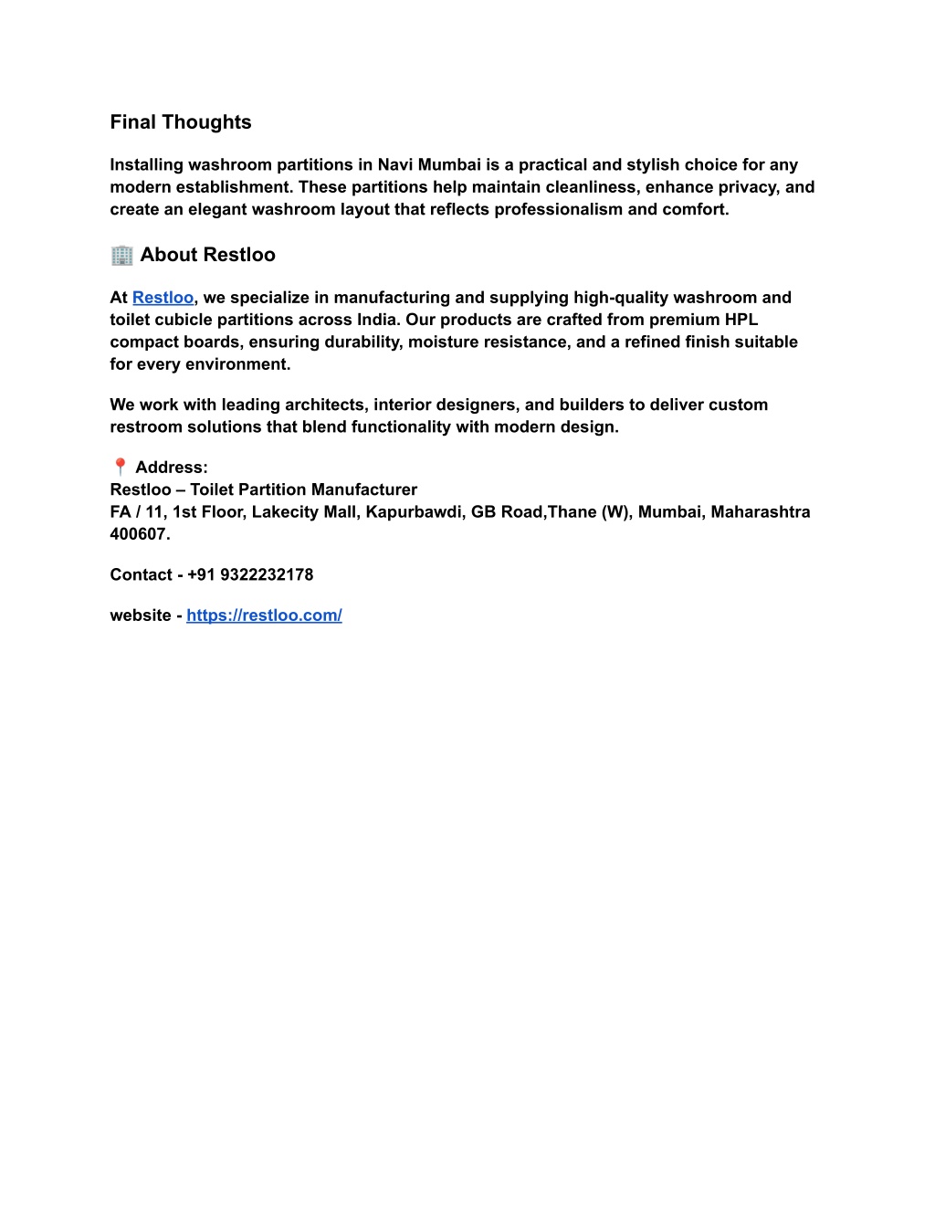 Final Thoughts Installing washroom partitions in Navi Mumbai is a practical and stylish choice for any modern establishment. These partitions help maintain cleanliness, enhance privacy, and create an elegant washroom layout that reflects professionalism and comfort. ? About Restloo At Restloo, we specialize in manufacturing and supplying high-quality washroom and toilet cubicle partitions across India. Our products are crafted from premium HPL compact boards, ensuring durability, moisture resistance, and a refined finish suitable for every environment. We work with leading architects, interior designers, and builders to deliver custom restroom solutions that blend functionality with modern design. ? Address: Restloo – Toilet Partition Manufacturer FA / 11, 1st Floor, Lakecity Mall, Kapurbawdi, GB Road,Thane (W), Mumbai, Maharashtra 400607. Contact - +91 9322232178 website - https://restloo.com/