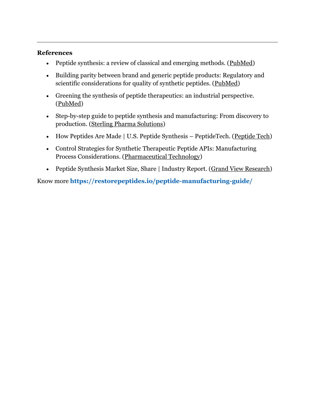 References Peptide synthesis: a review of classical and emerging methods. (PubMed) Building parity between brand and generic peptide products: Regulatory and scientific considerations for quality of synthetic peptides. (PubMed) Greening the synthesis of peptide therapeutics: an industrial perspective. (PubMed) Step-by-step guide to peptide synthesis and manufacturing: From discovery to production. (Sterling Pharma Solutions) How Peptides Are Made | U.S. Peptide Synthesis – PeptideTech. (Peptide Tech) Control Strategies for Synthetic Therapeutic Peptide APIs: Manufacturing Process Considerations. (Pharmaceutical Technology) Peptide Synthesis Market Size, Share | Industry Report. (Grand View Research) Know more https://restorepeptides.io/peptide-manufacturing-guide/