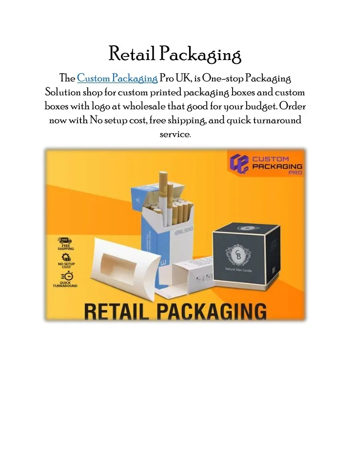 1. Retail Packaging The Custom Packaging Pro UK, is One-stop Packaging Solution shop for custom printed packaging boxes and custom boxes with logo at wholesale that good for your budget. Order now with No setup cost, free shipping, and quick turnaround service.