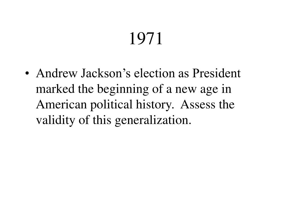 1971 • Andrew Jackson’s election as President marked the beginning of a new age in American political history. Assess the validity of this generalization.