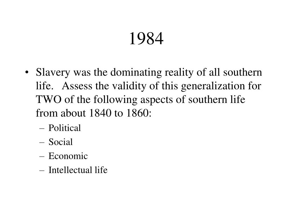 1984 • Slavery was the dominating reality of all southern life. Assess the validity of this generalization for TWO of the following aspects of southern life from about 1840 to 1860: • Political • Social • Economic • Intellectual life