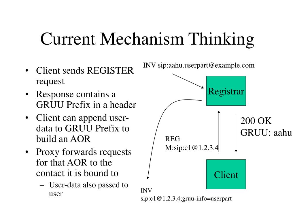 Client sends REGISTER request Response contains a GRUU Prefix in a header Client can append user-data to GRUU Prefix to build an AOR Proxy forwards requests for that AOR to the contact it is bound to User-data also passed to user Current Mechanism Thinking INV sip:aahu.userpart@example.com Registrar 200 OK GRUU: aahu REG M:sip:c1@1.2.3.4 Client INV sip:c1@1.2.3.4;gruu-info=userpart