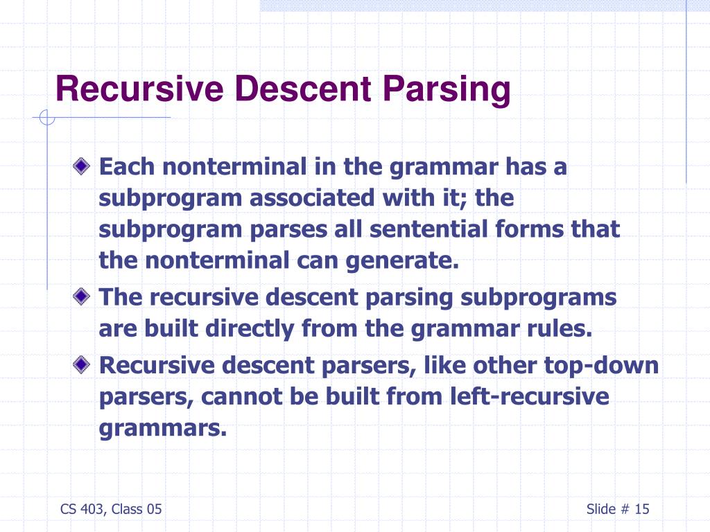 Recursive Descent Parsing • Each nonterminal in the grammar has a subprogram associated with it; the subprogram parses all sentential forms that the nonterminal can generate. • The recursive descent parsing subprograms are built directly from the grammar rules. • Recursive descent parsers, like other top-down parsers, cannot be built from left-recursive grammars.