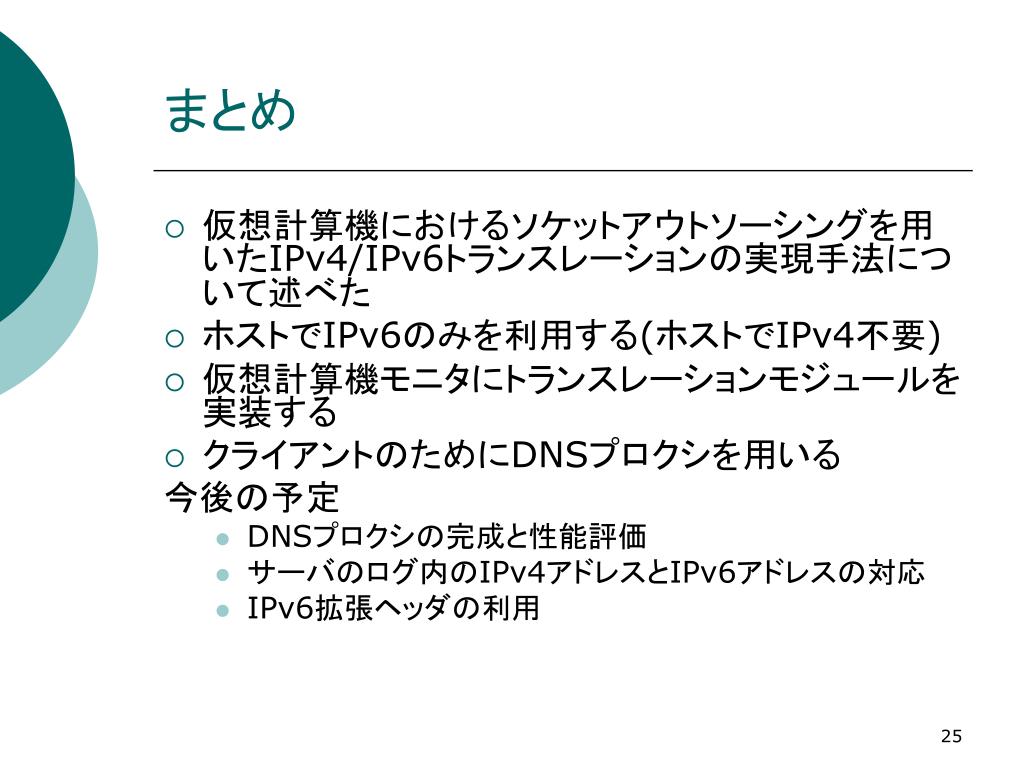 まとめ • 仮想計算機におけるソケットアウトソーシングを用いたIPv4/IPv6トランスレーションの実現手法について述べた • ホストでIPv6のみを利用する(ホストでIPv4不要) • 仮想計算機モニタにトランスレーションモジュールを実装する • クライアントのためにDNSプロクシを用いる 今後の予定 • DNSプロクシの完成と性能評価 • サーバのログ内のIPv4アドレスとIPv6アドレスの対応 • IPv6拡張ヘッダの利用