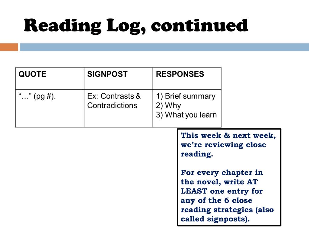 Reading Log, continued This week & next week, we’re reviewing close reading. For every chapter in the novel, write AT LEAST one entry for any of the 6 close reading strategies (also called signposts).