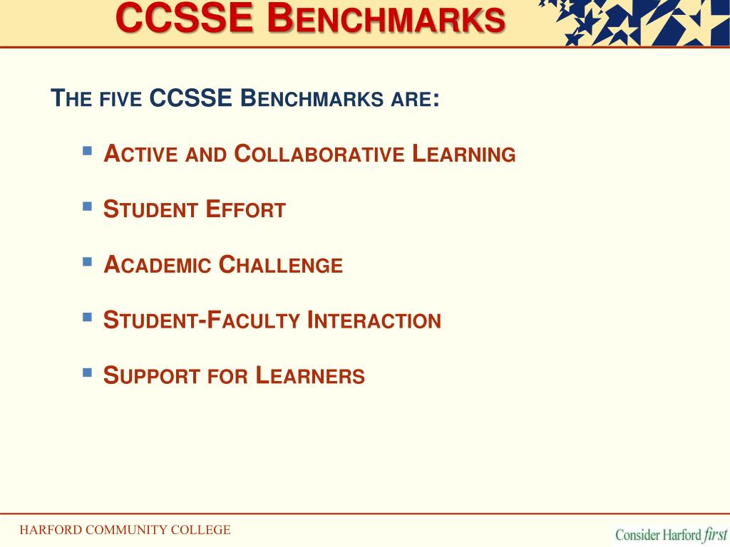 CCSSE Benchmarks The five CCSSE Benchmarks are: • Active and Collaborative Learning • Student Effort • Academic Challenge • Student-Faculty Interaction • Support for Learners HARFORD COMMUNITY COLLEGE