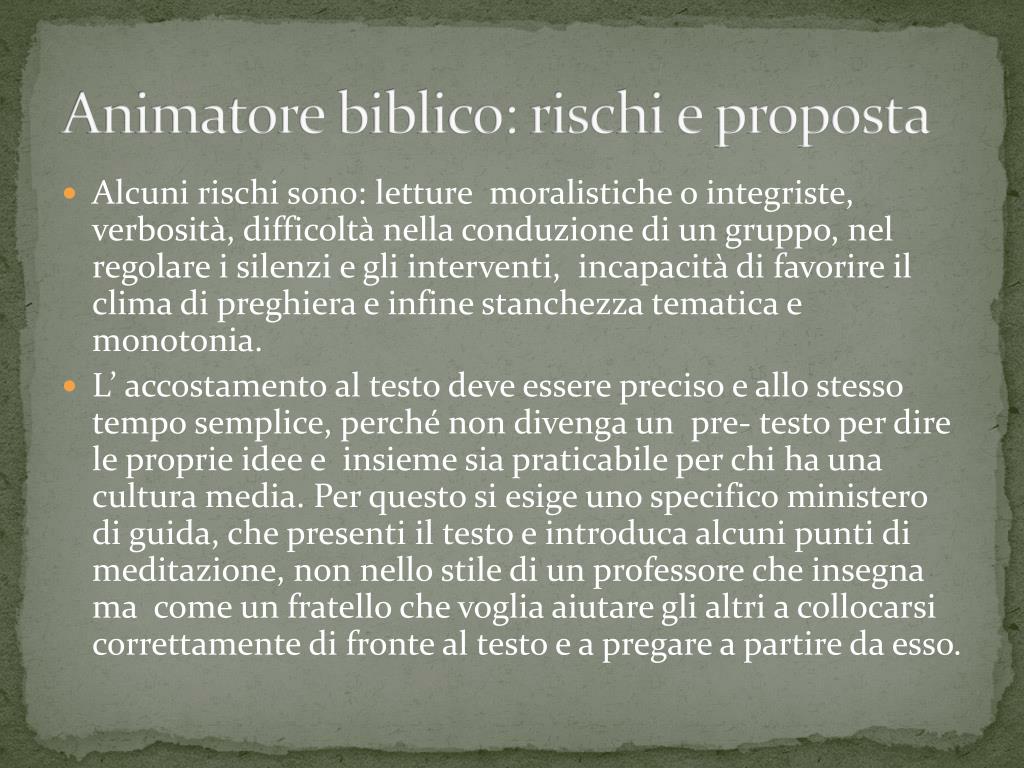 Animatore biblico: rischi e proposta • Alcuni rischi sono: letture moralistiche o integriste, verbosità, difficoltà nella conduzione di un gruppo, nel regolare i silenzi e gli interventi, incapacità di favorire il clima di preghiera e infine stanchezza tematica e monotonia. • L’ accostamento al testo deve essere preciso e allo stesso tempo semplice, perché non divenga un pre- testo per dire le proprie idee e insieme sia praticabile per chi ha una cultura media. Per questo si esige uno specifico ministero di guida, che presenti il testo e introduca alcuni punti di meditazione, non nello stile di un professore che insegna ma come un fratello che voglia aiutare gli altri a collocarsi correttamente di fronte al testo e a pregare a partire da esso.