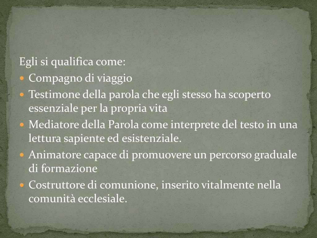 Egli si qualifica come: • Compagno di viaggio • Testimone della parola che egli stesso ha scoperto essenziale per la propria vita • Mediatore della Parola come interprete del testo in una lettura sapiente ed esistenziale. • Animatore capace di promuovere un percorso graduale di formazione • Costruttore di comunione, inserito vitalmente nella comunità ecclesiale.