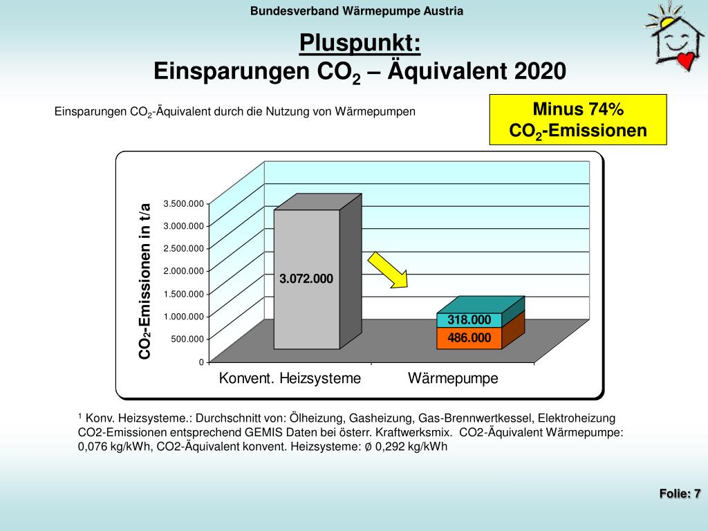 Pluspunkt:Einsparungen CO2 – Äquivalent 2020 Minus 74% CO2-Emissionen Einsparungen CO2-Äquivalent durch die Nutzung von Wärmepumpen 1 Konv. Heizsysteme.: Durchschnitt von: Ölheizung, Gasheizung, Gas-Brennwertkessel, Elektroheizung CO2-Emissionen entsprechend GEMIS Daten bei österr. Kraftwerksmix. CO2-Äquivalent Wärmepumpe: 0,076 kg/kWh, CO2-Äquivalent konvent. Heizsysteme: ∅ 0,292 kg/kWh
