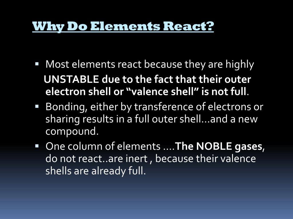 Why Do Elements React? • Most elements react because they are highly UNSTABLE due to the fact that their outer electron shell or “valence shell” is not full. • Bonding, either by transference of electrons or sharing results in a full outer shell…and a new compound. • One column of elements ….The NOBLE gases, do not react..are inert , because their valence shells are already full.