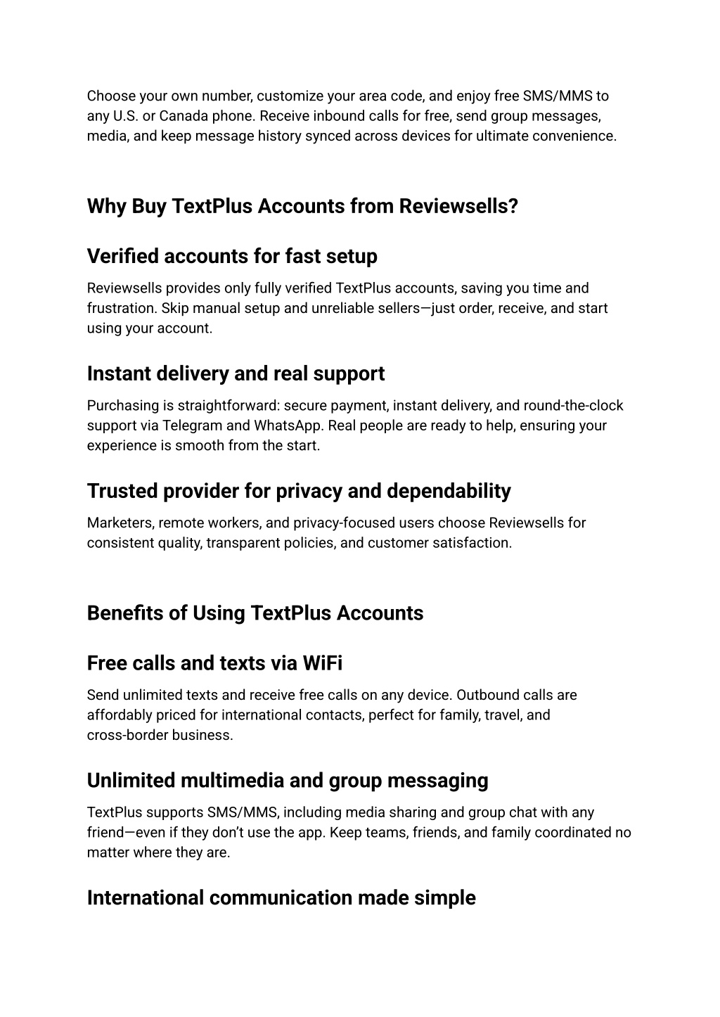 3. TextPlus is ideal for travelers or anyone needing to stay connected globally. With the second number feature, avoid expensive roaming and maintain privacy without contracts or extra fees. How to Buy TextPlus Accounts 1. Select your package at 2. Reviewsells TextPlus Service 3. Place your order securely using trusted payment options. 4. Receive your verified account instantly with full login details. 5. Start texting/calling worldwide from any WiFi-enabled device. Use Cases for TextPlus Numbers Personal privacy and travel Protect your personal number while posting online, making deals, or traveling abroad. Change your number anytime for added security. Business, marketing, and remote teams Businesses use TextPlus for customer support, outreach, and managing separate lines for staff—no telecom contracts needed. Groups and remote teams stay organized with shared numbers and history sync. Online sales and dating platforms Keep your real contact details safe when selling items, using marketplaces, or networking. Use temporary or dedicated numbers to prevent spam and unwanted calls. Reviewsells – Experience, Security, and Support What sets Reviewsells apart ● All accounts are checked and verified ● Instant delivery and zero hidden fees ● 24/7 support via Telegram or WhatsApp