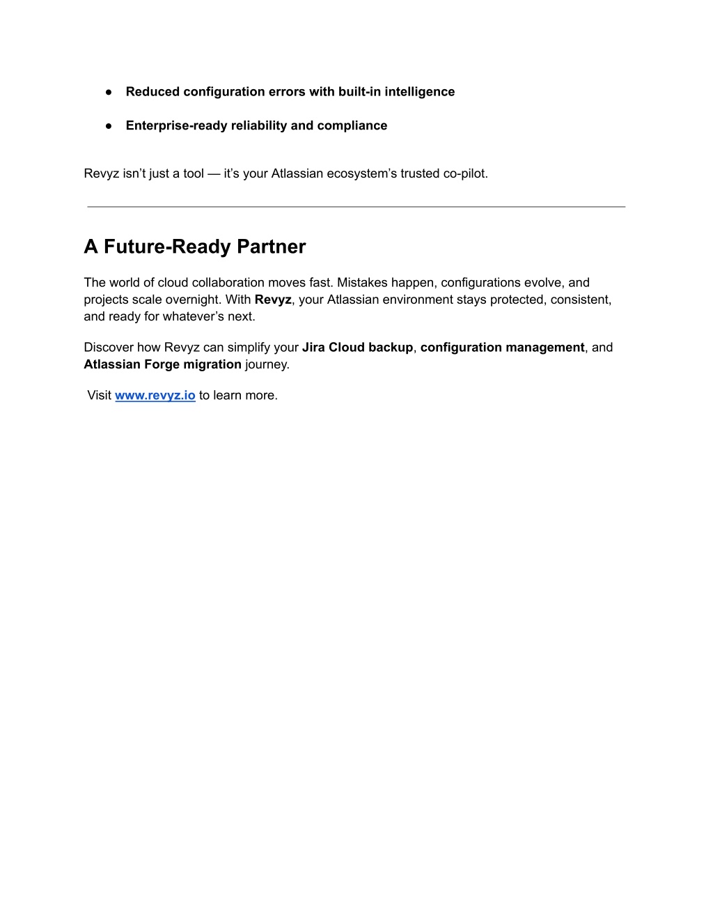 6. ● Reduced configuration errors with built-in intelligence ● Enterprise-ready reliability and compliance Revyz isn’t just a tool — it’s your Atlassian ecosystem’s trusted co-pilot. A Future-Ready Partner The world of cloud collaboration moves fast. Mistakes happen, configurations evolve, and projects scale overnight. With Revyz, your Atlassian environment stays protected, consistent, and ready for whatever’s next. Discover how Revyz can simplify your Jira Cloud backup, configuration management, and Atlassian Forge migration journey. Visit www.revyz.io to learn more.