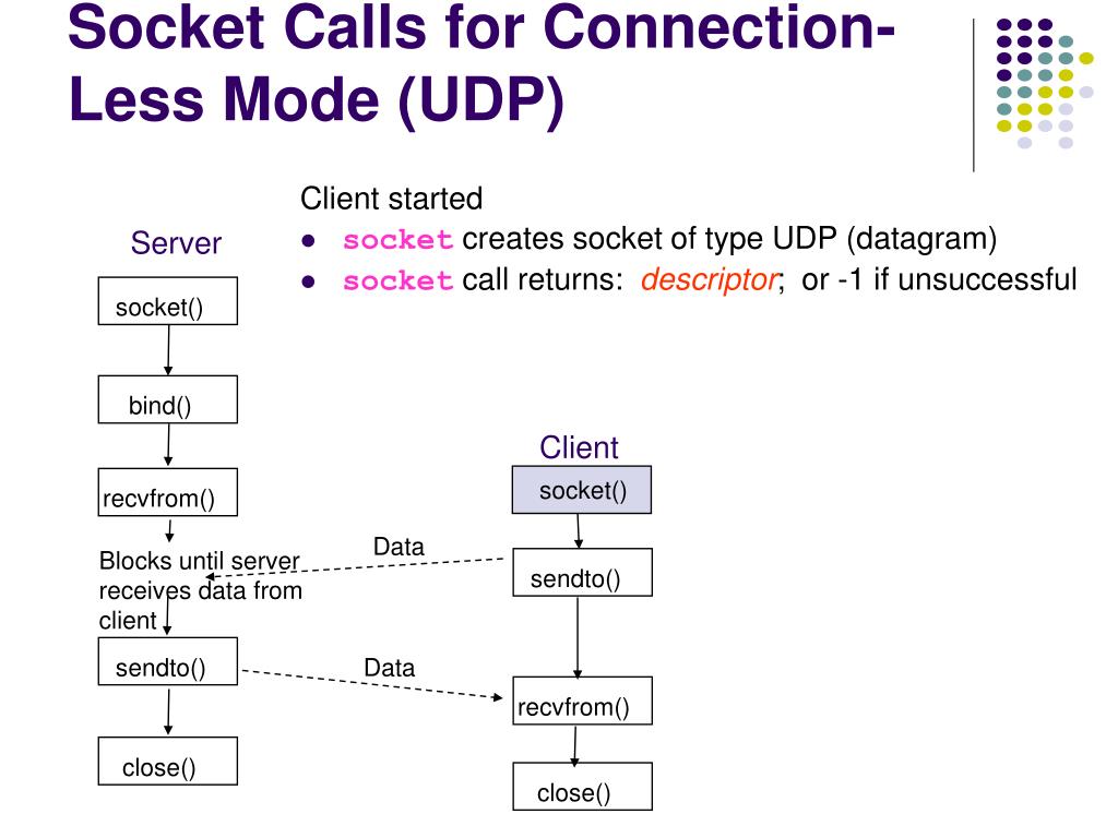 socket() recvfrom() close() close() Socket Calls for Connection-Less Mode (UDP) Client started • socket creates socket of type UDP (datagram) • socket call returns: descriptor; or -1 if unsuccessful Server socket() bind() Client recvfrom() Data Blocks until server receives data from client sendto() sendto() Data