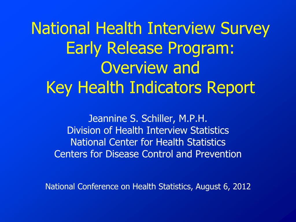 National Health Interview Survey Early Release Program: Overview and Key Health Indicators Report. Jeannine S. Schiller , M.P.H. Division of Health Interview Statistics National Center for Health Statistics Centers for Disease Control and Prevention.