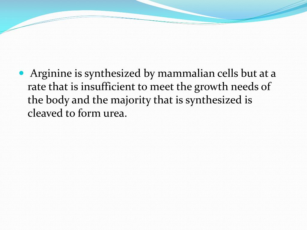 Arginine is synthesized by mammalian cells but at a rate that is insufficient to meet the growth needs of the body and the majority that is synthesized is cleaved to form urea.