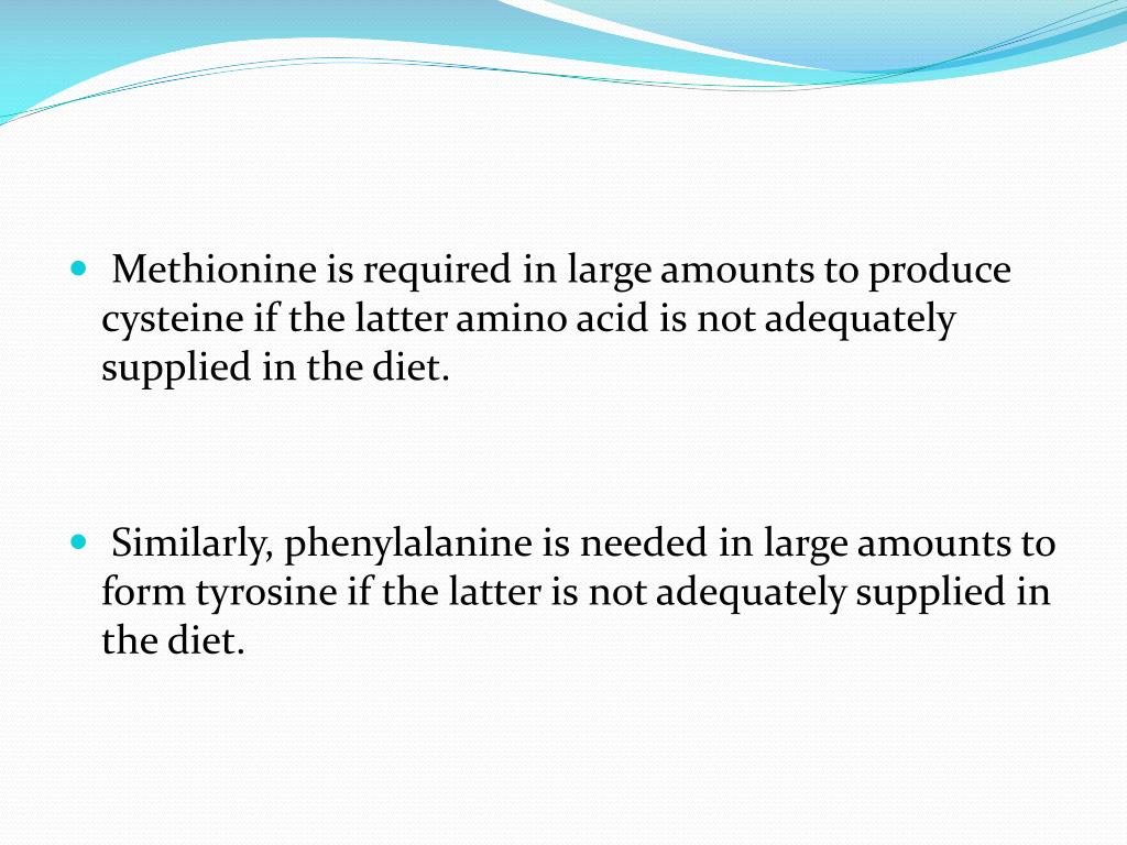 Methionine is required in large amounts to produce cysteine if the latter amino acid is not adequately supplied in the diet. • Similarly, phenylalanine is needed in large amounts to form tyrosine if the latter is not adequately supplied in the diet.