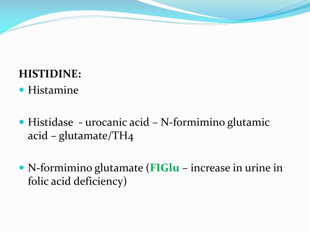 HISTIDINE: • Histamine • Histidase - urocanic acid – N-formiminoglutamic acid – glutamate/TH4 • N-formimino glutamate (FIGlu – increase in urine in folic acid deficiency)