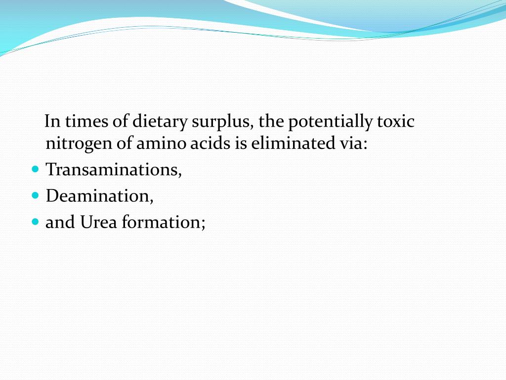 In times of dietary surplus, the potentially toxic nitrogen of amino acids is eliminated via: • Transaminations, • Deamination, • and Urea formation;