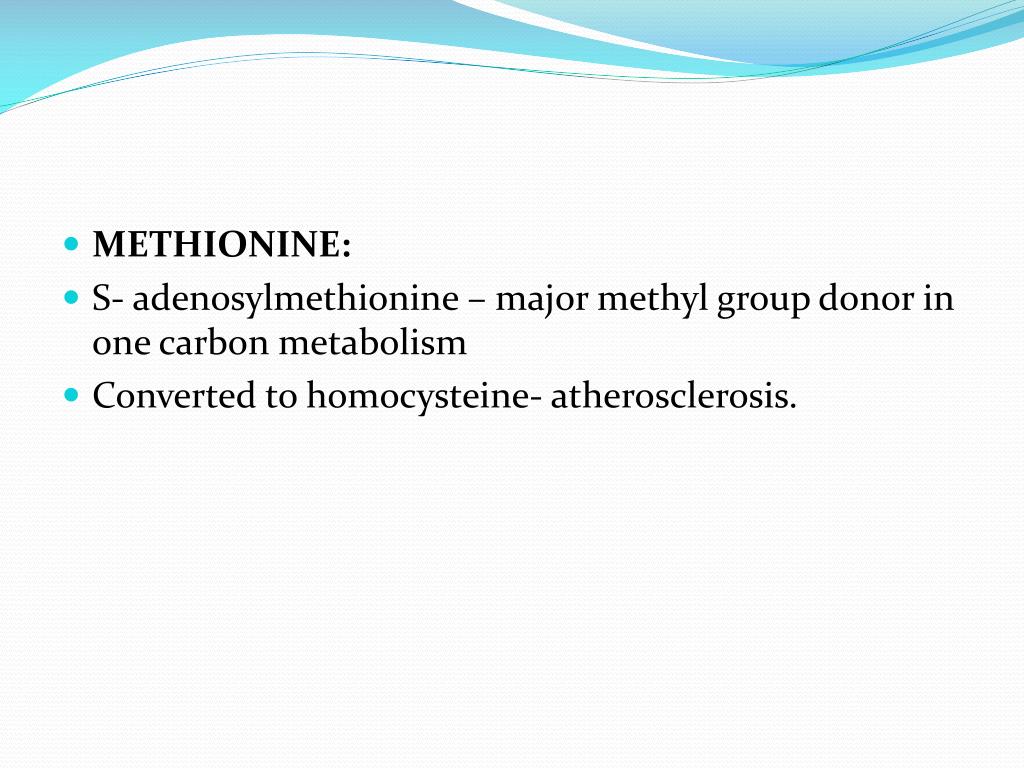 METHIONINE: • S- adenosylmethionine – major methyl group donor in one carbon metabolism • Converted to homocysteine- atherosclerosis.