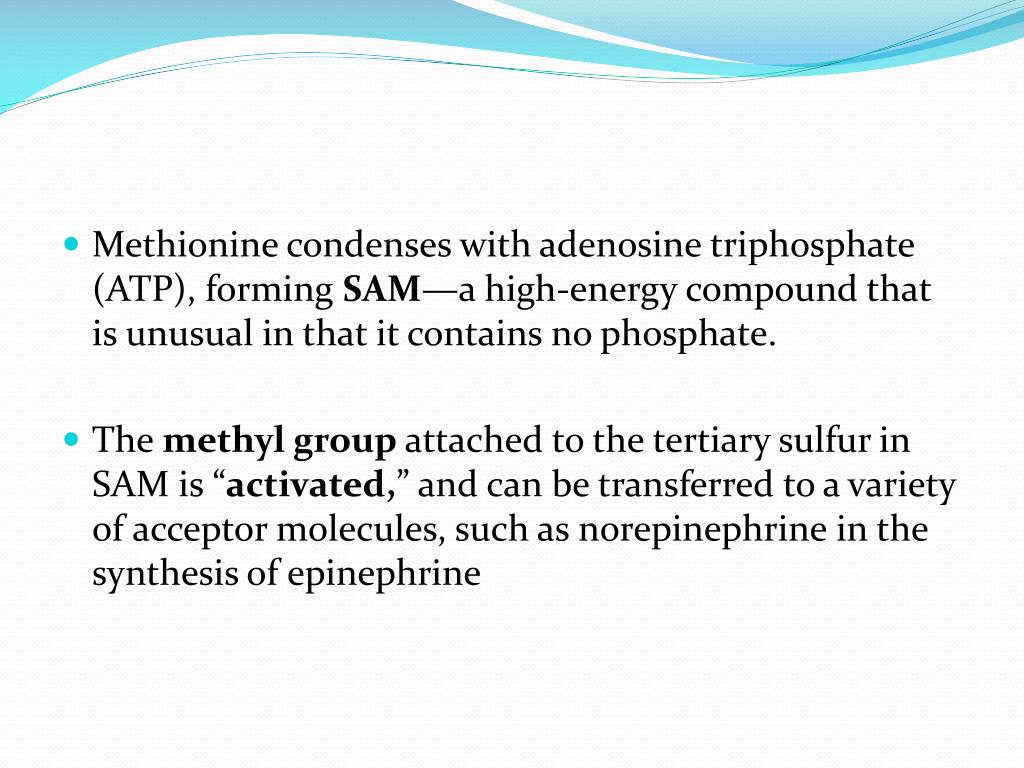 Methionine condenses with adenosine triphosphate (ATP), forming SAM—a high-energy compound that is unusual in that it contains no phosphate. • The methyl group attached to the tertiary sulfur in SAM is “activated,” and can be transferred to a variety of acceptor molecules, such as norepinephrine in the synthesis of epinephrine