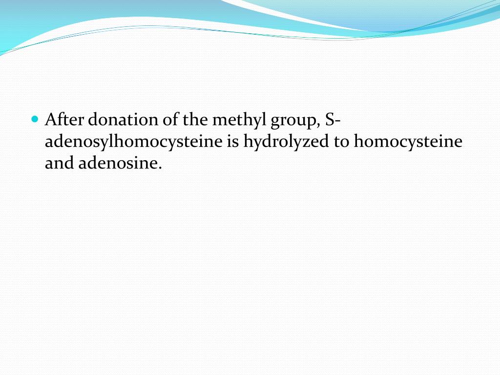 After donation of the methyl group, S-adenosylhomocysteine is hydrolyzed to homocysteine and adenosine.