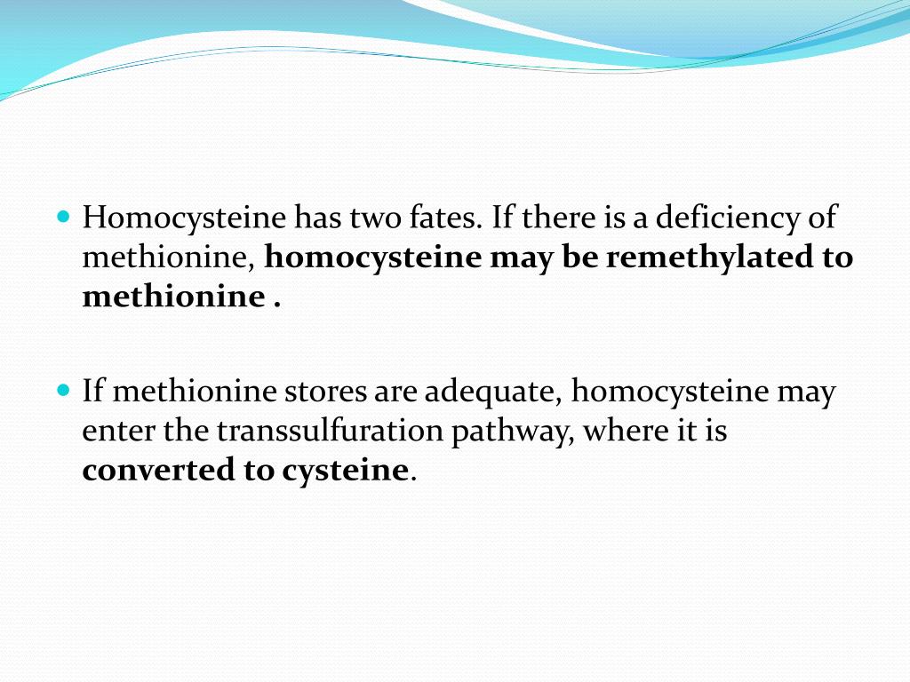 Homocysteine has two fates. If there is a deficiency of methionine, homocysteine may be remethylated to methionine . • If methionine stores are adequate, homocysteine may enter the transsulfuration pathway, where it is converted to cysteine.