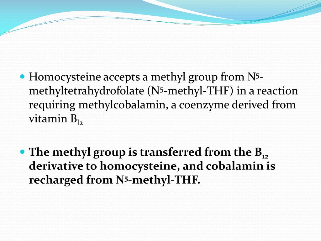 Homocysteine accepts a methyl group from N5-methyltetrahydrofolate (N5-methyl-THF) in a reaction requiring methylcobalamin, a coenzyme derived from vitamin Bl2 • The methyl group is transferred from the B12 derivative to homocysteine, and cobalamin is recharged from N5-methyl-THF.
