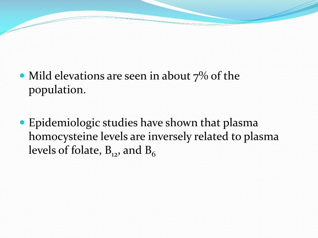 Mild elevations are seen in about 7% of the population. • Epidemiologic studies have shown that plasma homocysteine levels are inversely related to plasma levels of folate, B12, and B6